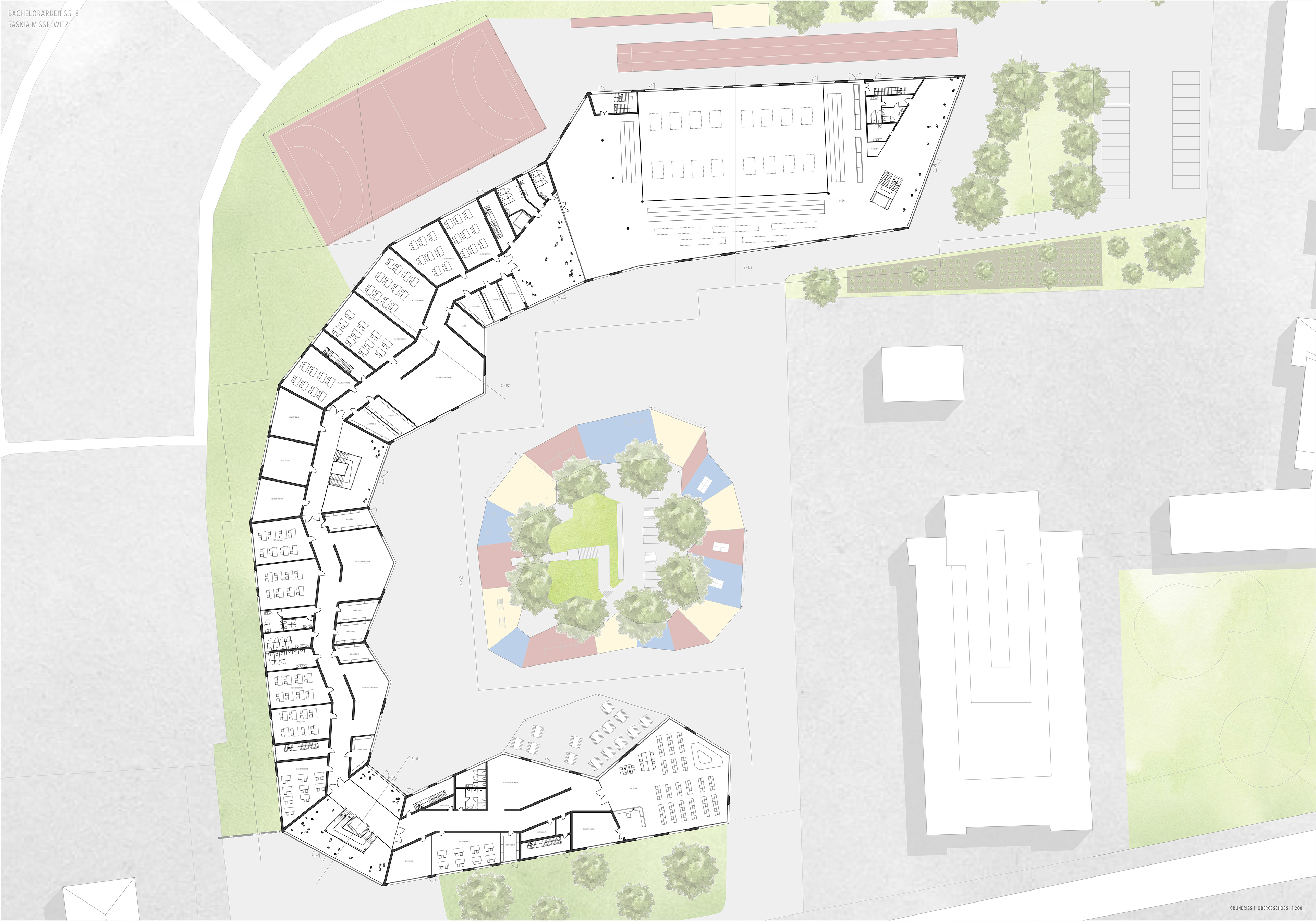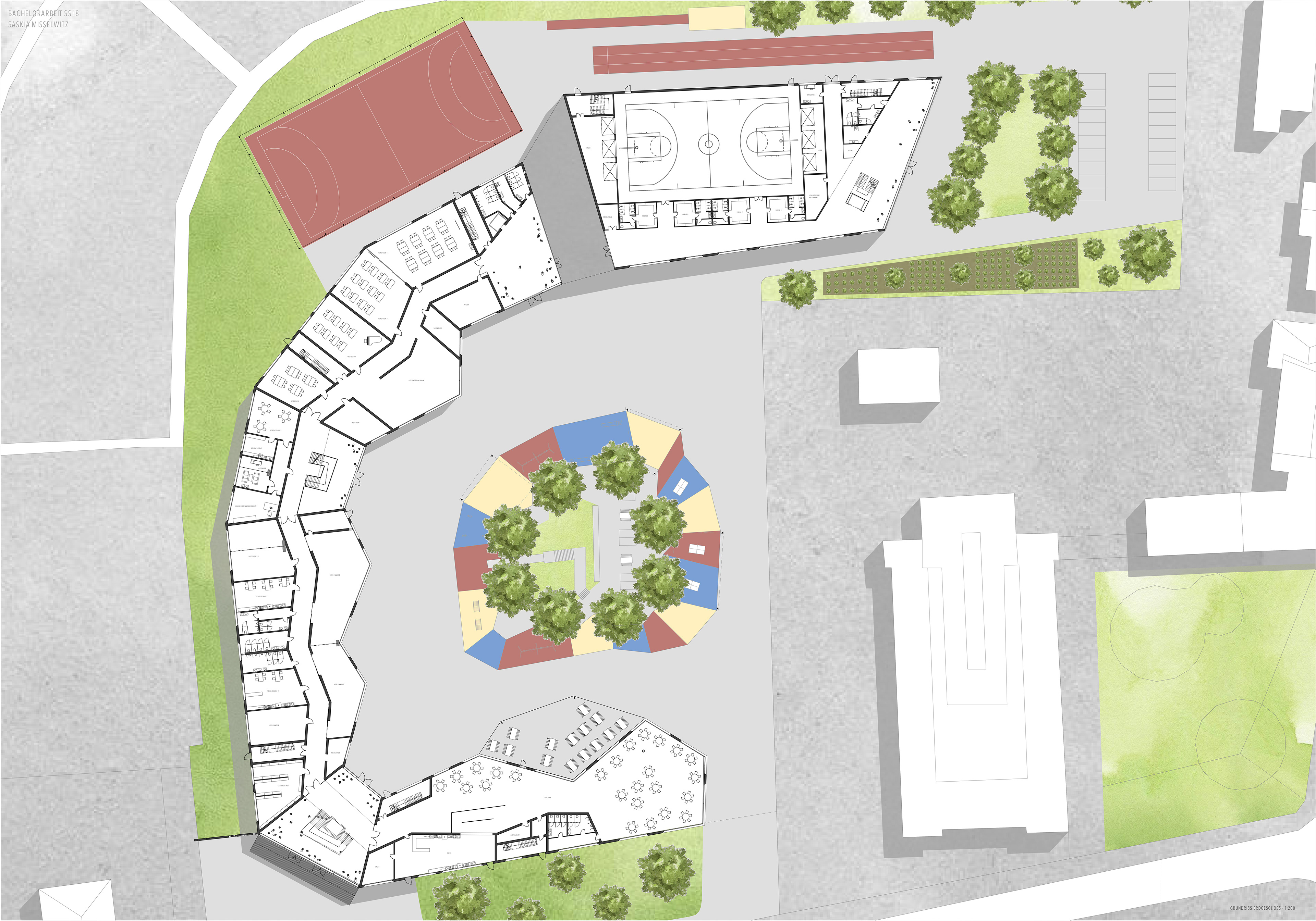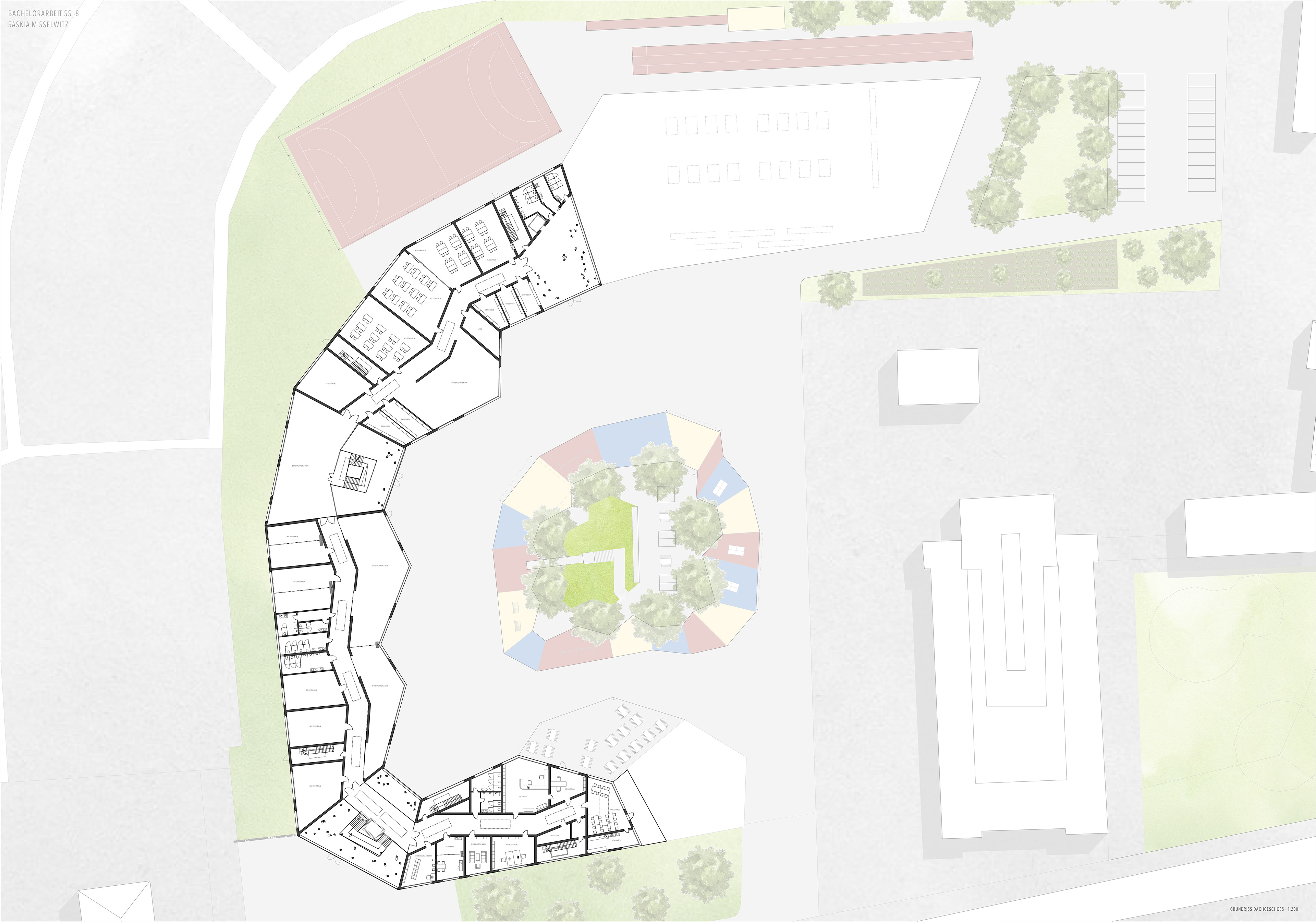 DIE ZUM ÖFFENTLICHEN BEREICH GERICHTETE FASSADE NIMMT SICH BEWUSST ZURÜCK WÄHREND DIE FASSADE ZUM INNENHOF EINE ZACKENARTIGE FORMSPRACHE AUFWEIST , DIESE SOLL DAS LEBHAFTE WESEN DER SCHÜLER AUFNEHMEN, WIDERSPIEGEN UND EINEN ANSPRECHENDEN INNENBEREICH SCHAFFEN. DAS SO ENTSTEHENDE RAUMGEFÜGE SCHAFFT SOWOHL VON AUßEN EINEN REIZVOLLEN ANBLICK ALS AUCH VON INNEN EIN SPANNENDES ERLEBEN DER RÄUMLICHKEITEN.