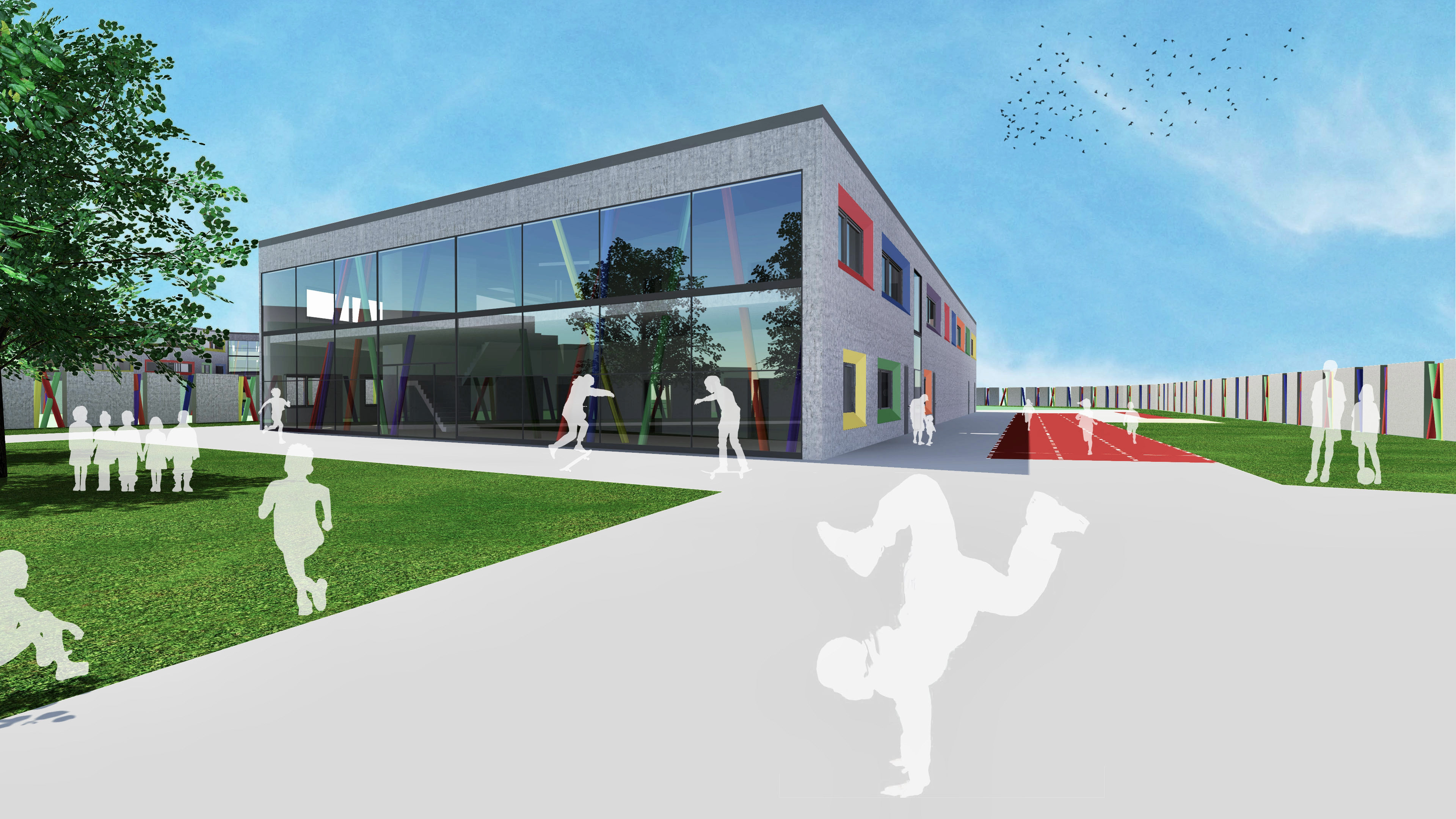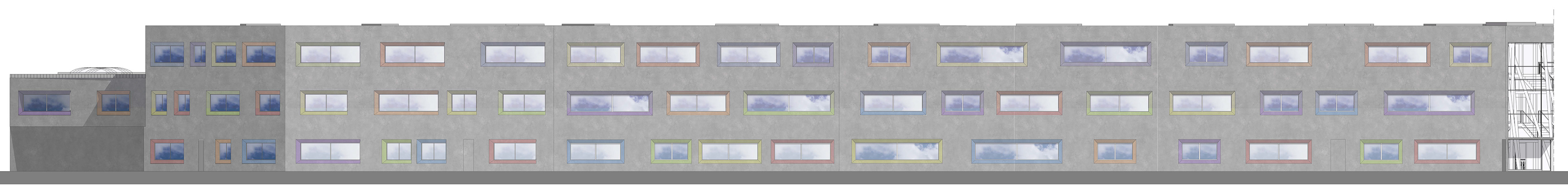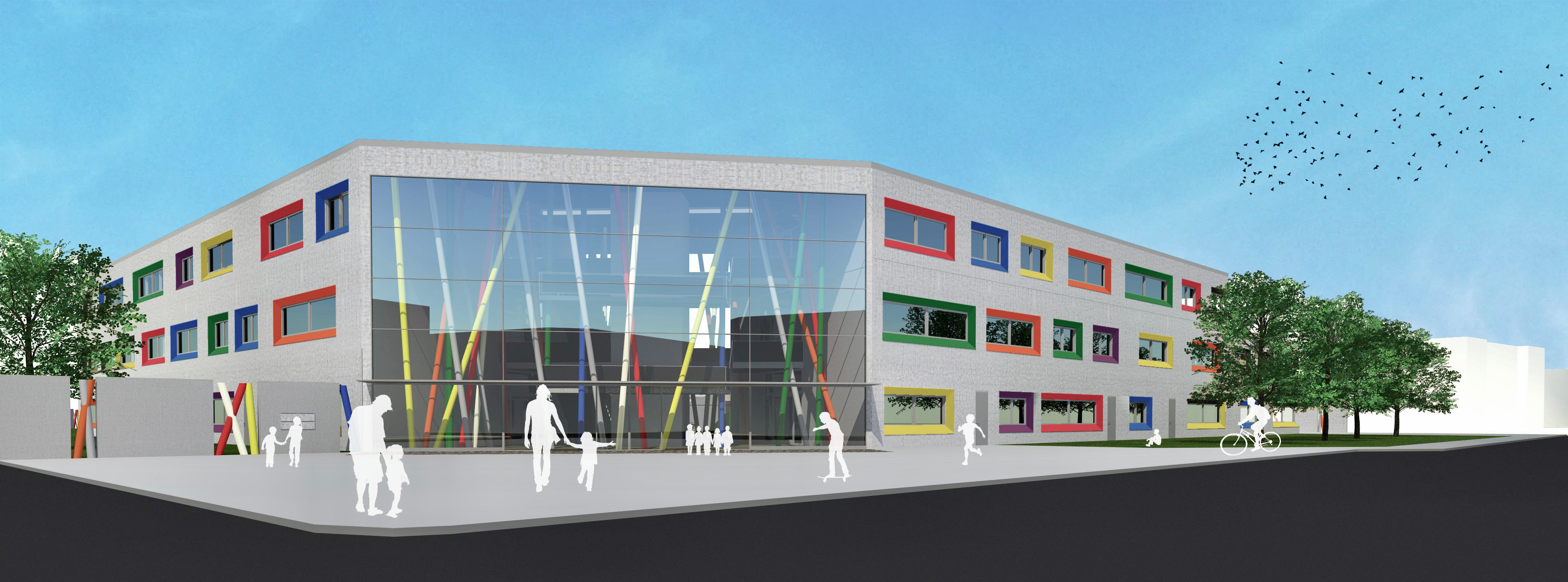 DIE ÄUßERLICHE ERSCHEINUNG IST AUF EINE SCHLICHTE BETONFASSADE REDUZIERT, WELCHE JEDOCH DURCH BUNT LASIERTE FASCHEN AN DEN FENSTERN FREUNDLICH UND EINLADEND WIRKT. AUßERDEM ERMÖGLICHEN DIE FASCHEN EINEN GRÖßEREN EINFALLWINKEL DES SONNENLICHTS, SODASS NATÜRLICHES LICHT LÄNGER ALS LICHTQUELLE GENUTZT WERDEN KANN. DIES FÜHRT ZU EINEM ANGENEHMEREN LERNKLIMA UND EINER ENERGIEERSPARNIS.