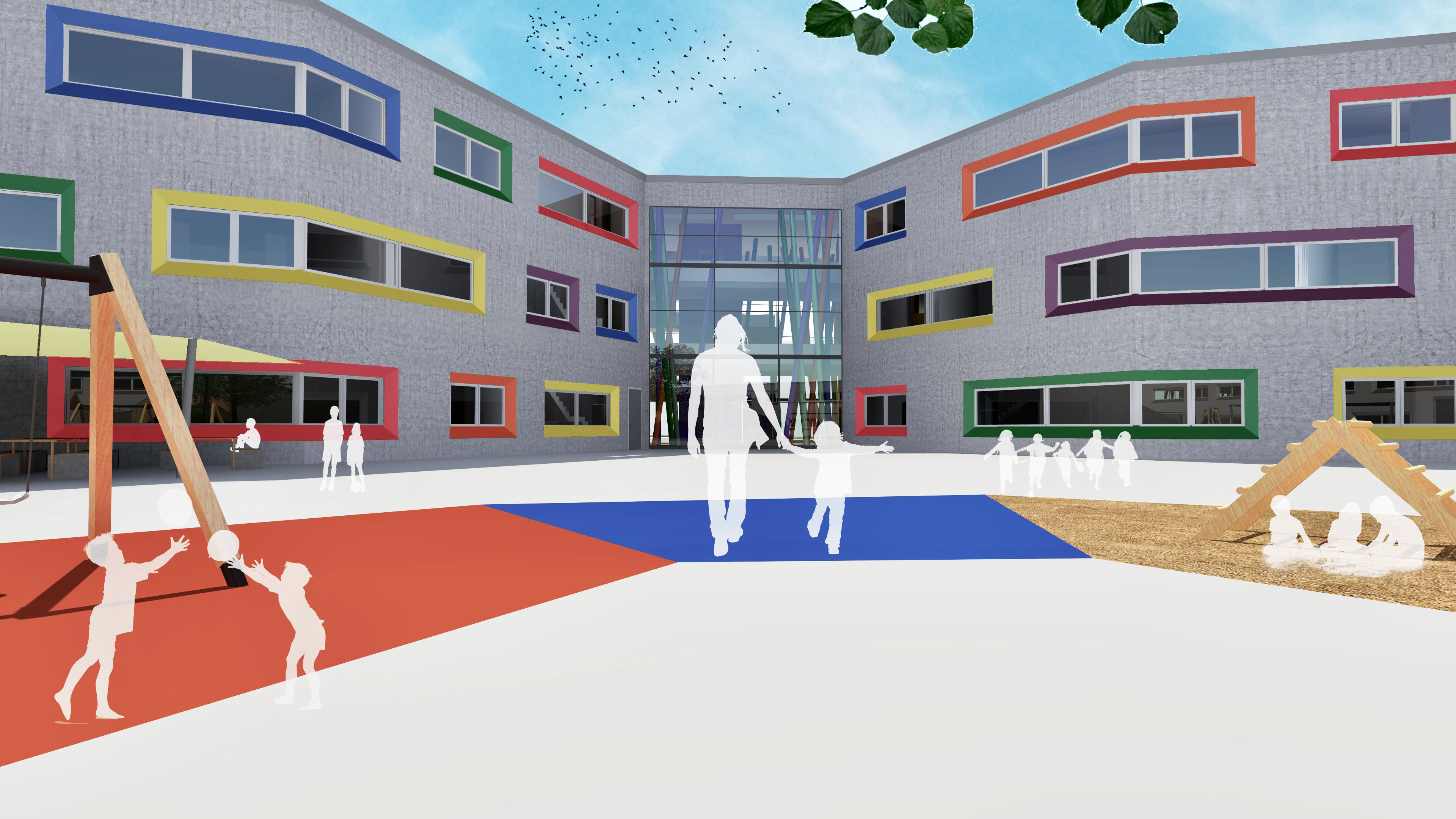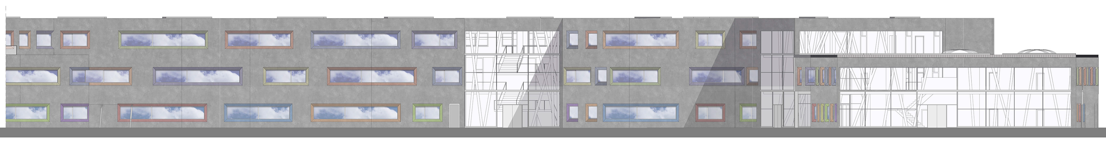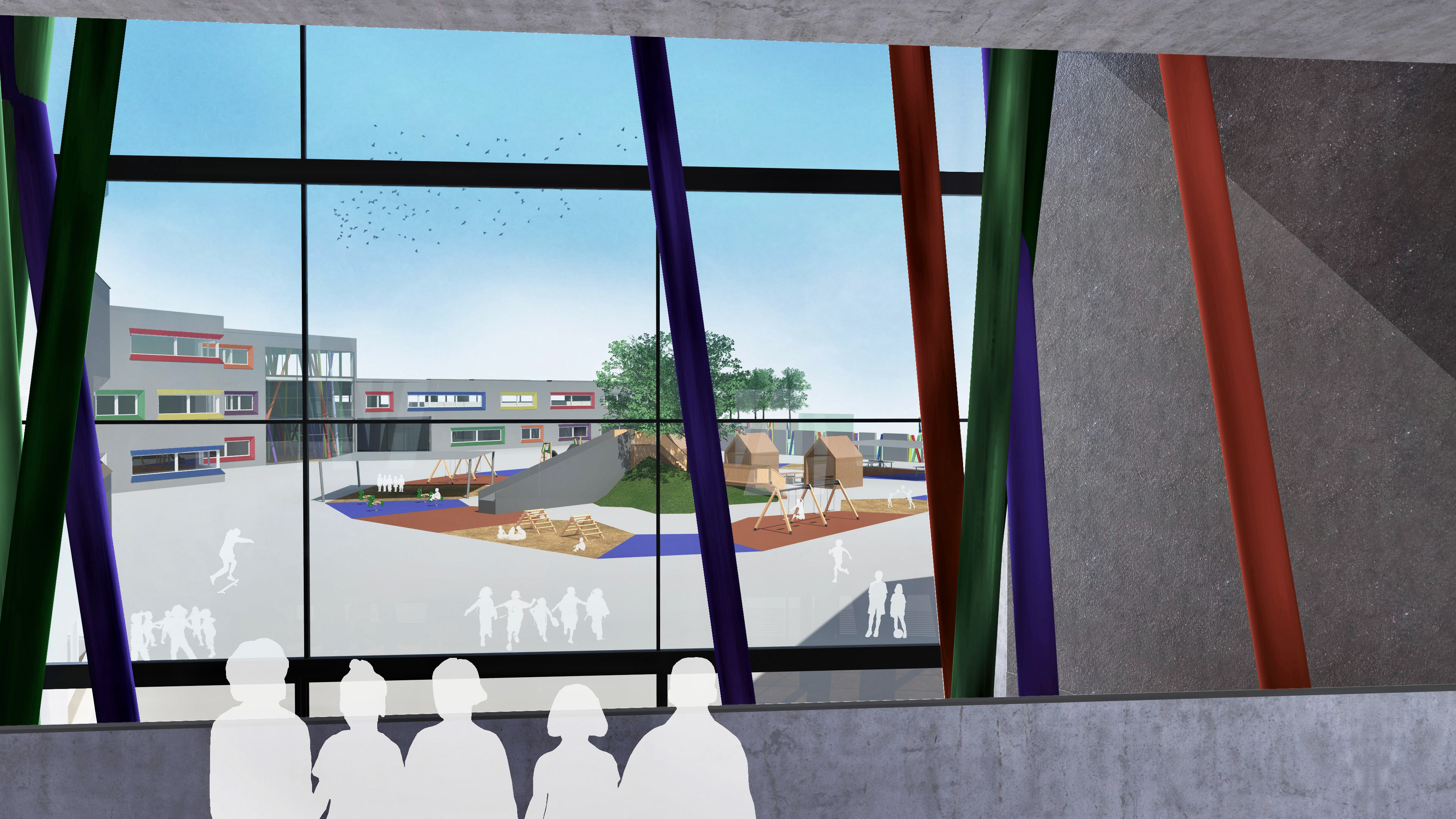 DIE ÄUßERLICHE ERSCHEINUNG IST AUF EINE SCHLICHTE BETONFASSADE REDUZIERT, WELCHE JEDOCH DURCH BUNT LASIERTE FASCHEN AN DEN FENSTERN FREUNDLICH UND EINLADEND WIRKT. AUßERDEM ERMÖGLICHEN DIE FASCHEN EINEN GRÖßEREN EINFALLWINKEL DES SONNENLICHTS, SODASS NATÜRLICHES LICHT LÄNGER ALS LICHTQUELLE GENUTZT WERDEN KANN. DIES FÜHRT ZU EINEM ANGENEHMEREN LERNKLIMA UND EINER ENERGIEERSPARNIS.