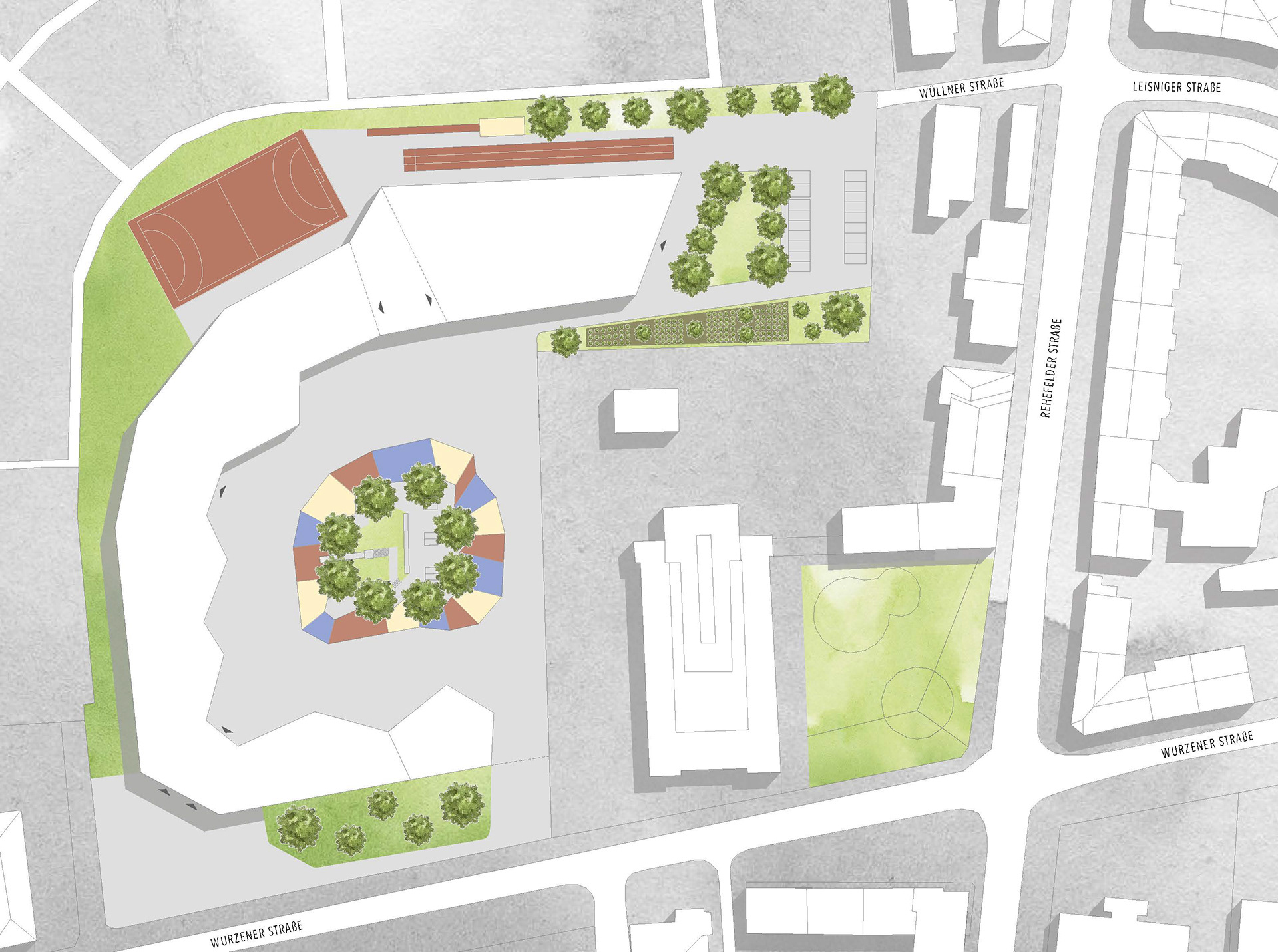 ES GALT EINE VIERZÜGIGE GRUNDSCHULE ZU KONZIPIEREN. DAS ZU BEBAUENDE GRUNDSTÜCK BEFINDET SICH IN DER WURZENER STRAßE, DRESDEN UND WEIST EIN WINKLIGES ABER GROßZÜGIGES FLÄCHENANGEBOT AUF. UM DEN ANFORDERUNGEN GERECHT ZU WERDEN ENTSTAND EIN MULTIFUNKTIONALES DREIGESCHOSSIGES GEBÄUDE, DESSEN FORM EINE VIELZAHL AN NUTZUNGEN VEREINT.