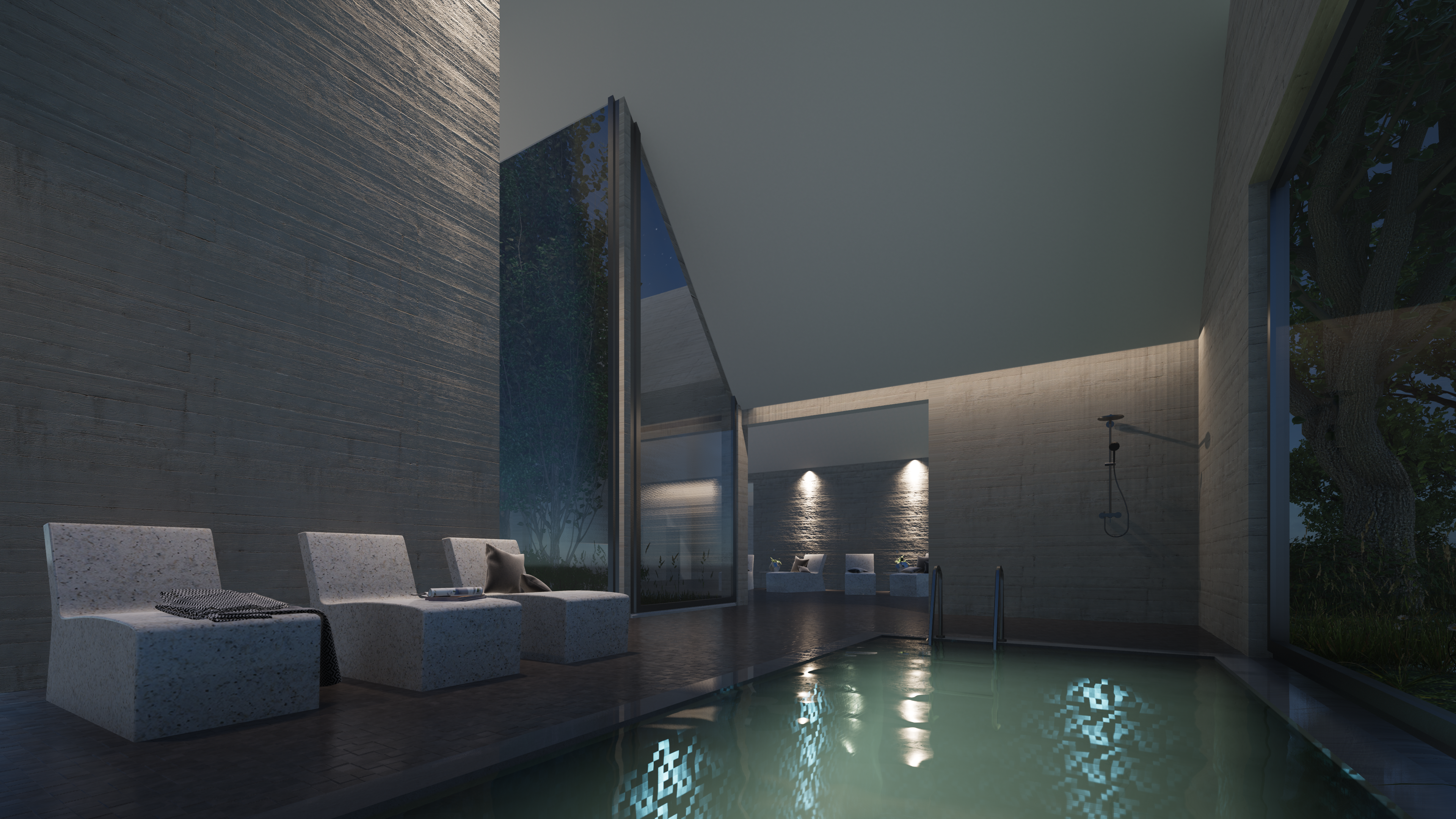 Sowohl die Fassade als auch die Dachdeckung ist einheitlich in Beton gehalten, so erhält das Gebäude eine monolithische und homogene Anmutung.