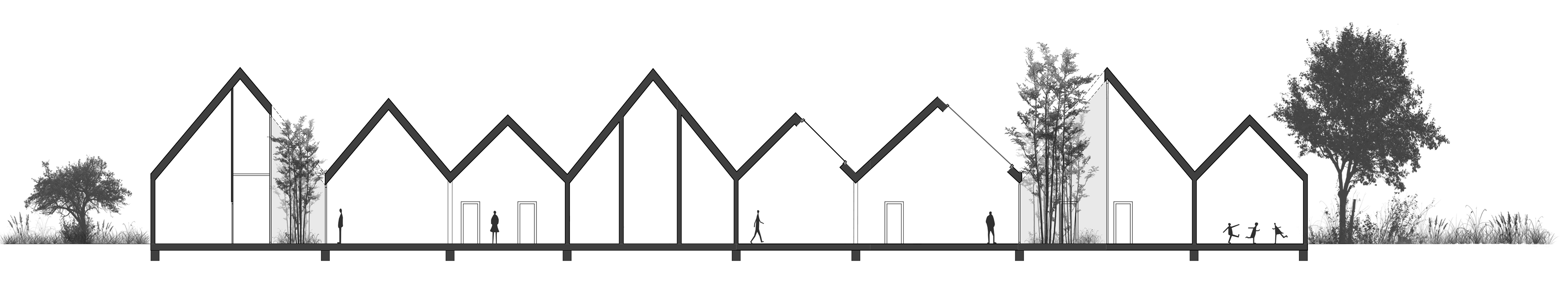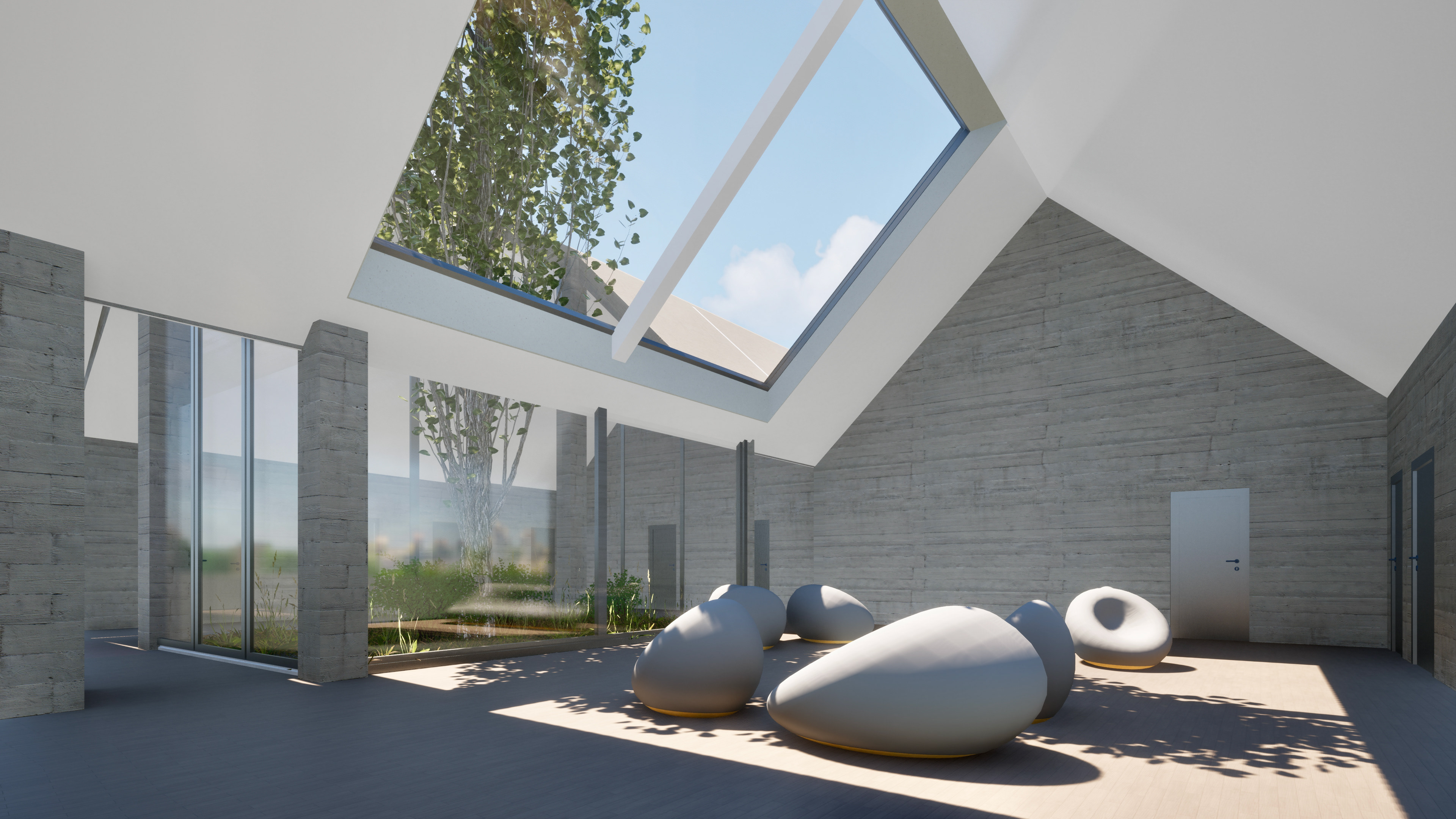 Aufgebrochen wird diese aus Satteldächern entstehende Dachlandschaft durch Atrien, welche die Räume mit Licht durchfluten und die Natur in das Gebäude transportieren.